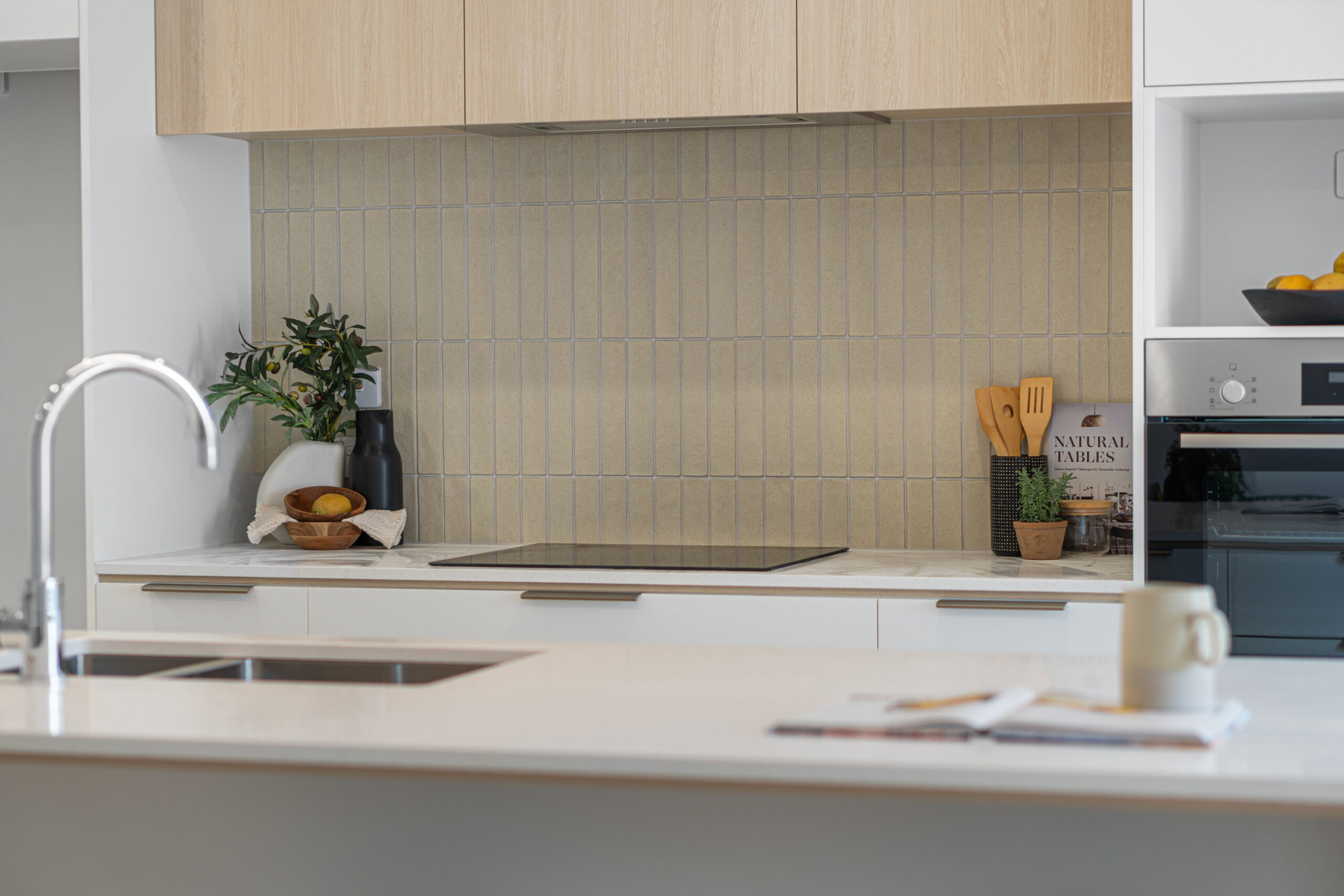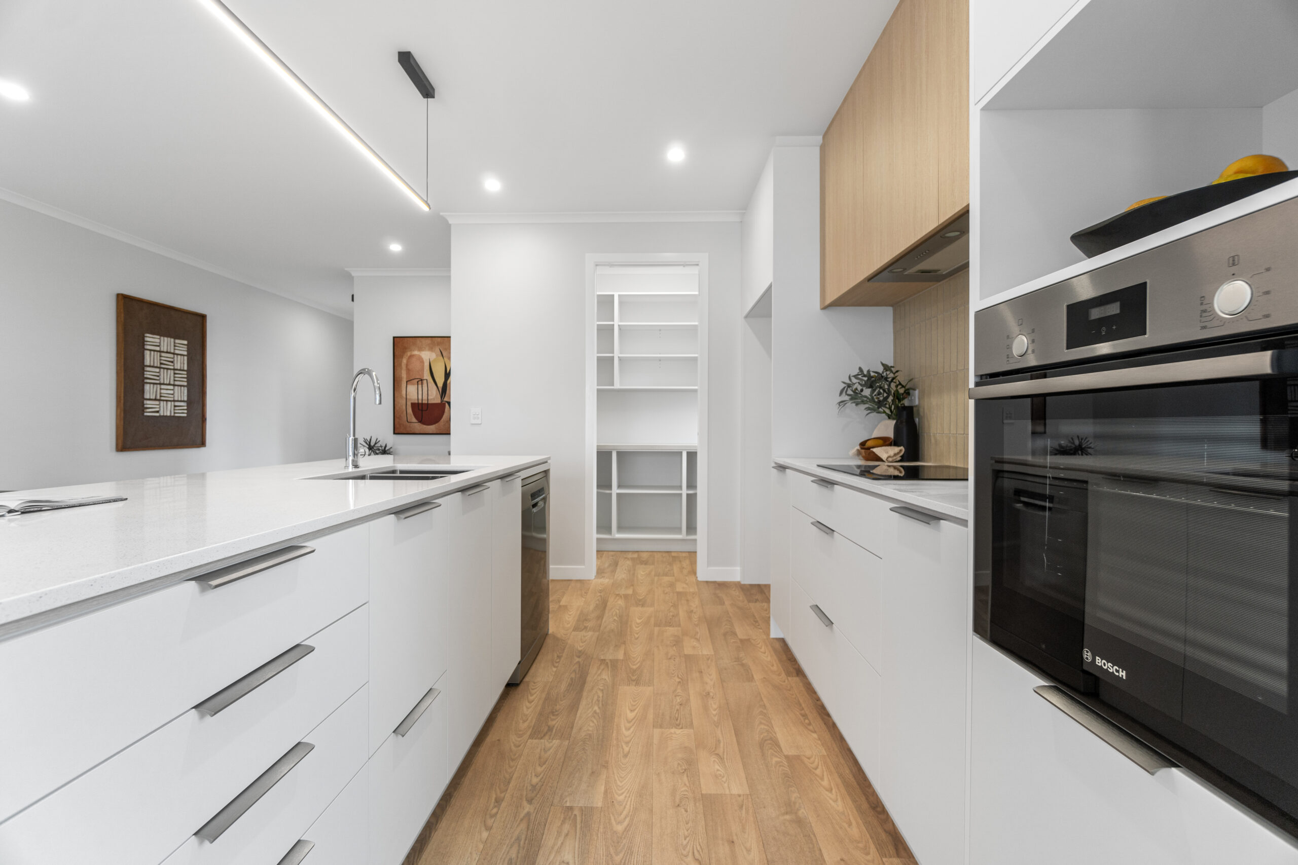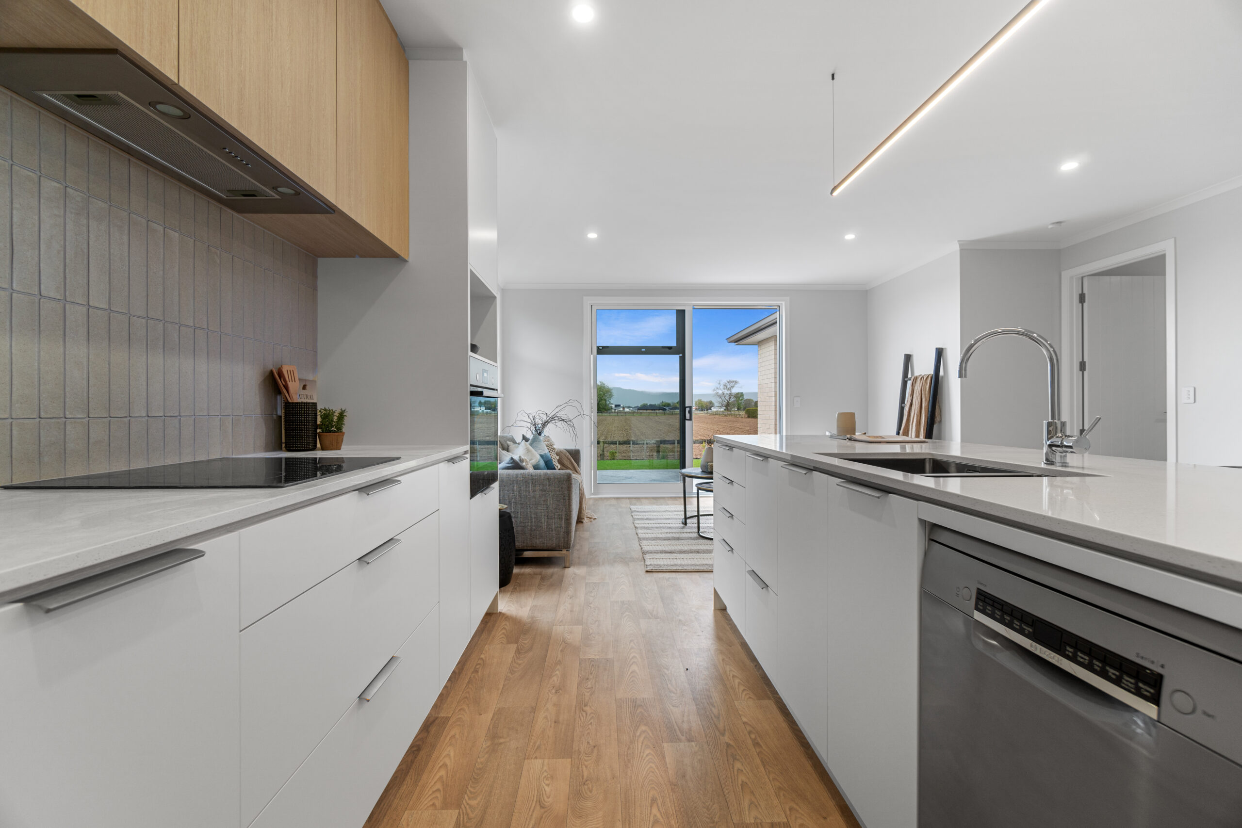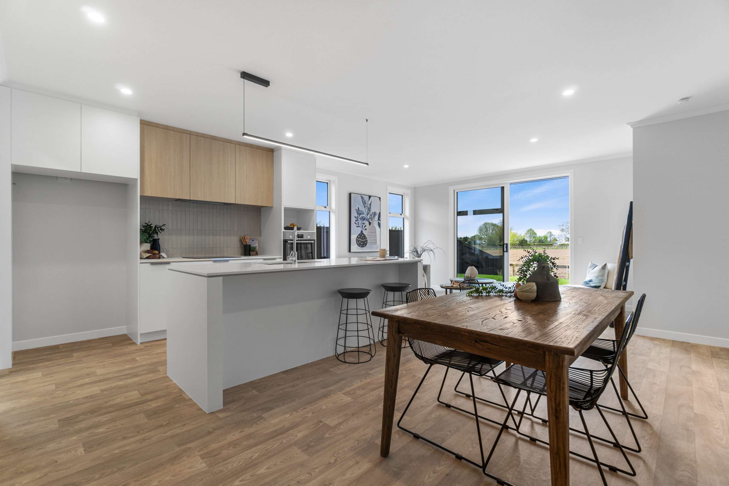 The open plan kitchen, dining, and living area provides a warm and inviting hub for family life, while the designer kitchen, complete with stone benchtops and a walk-in pantry, makes meal preparation a pleasure. Generous windows bring in natural light and showcase peaceful rural and Kaimai views.